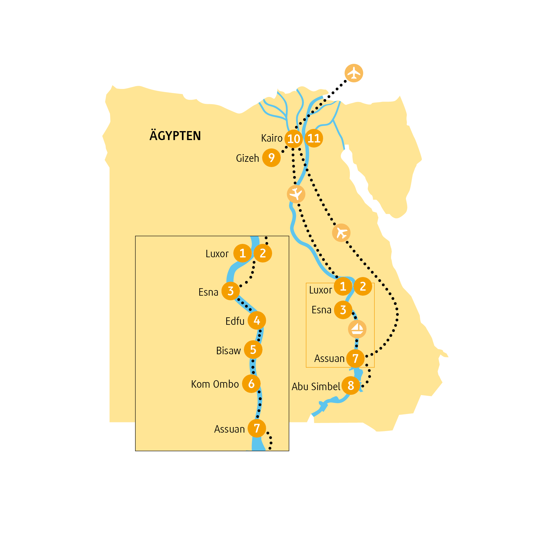 Die Fahrstrecke umfasst ca. 30 km. Zu deiner Unterkunft, zur Insel Elephantine und zum Philae-Tempel setzt du jeweils mit einem Motorboot über.