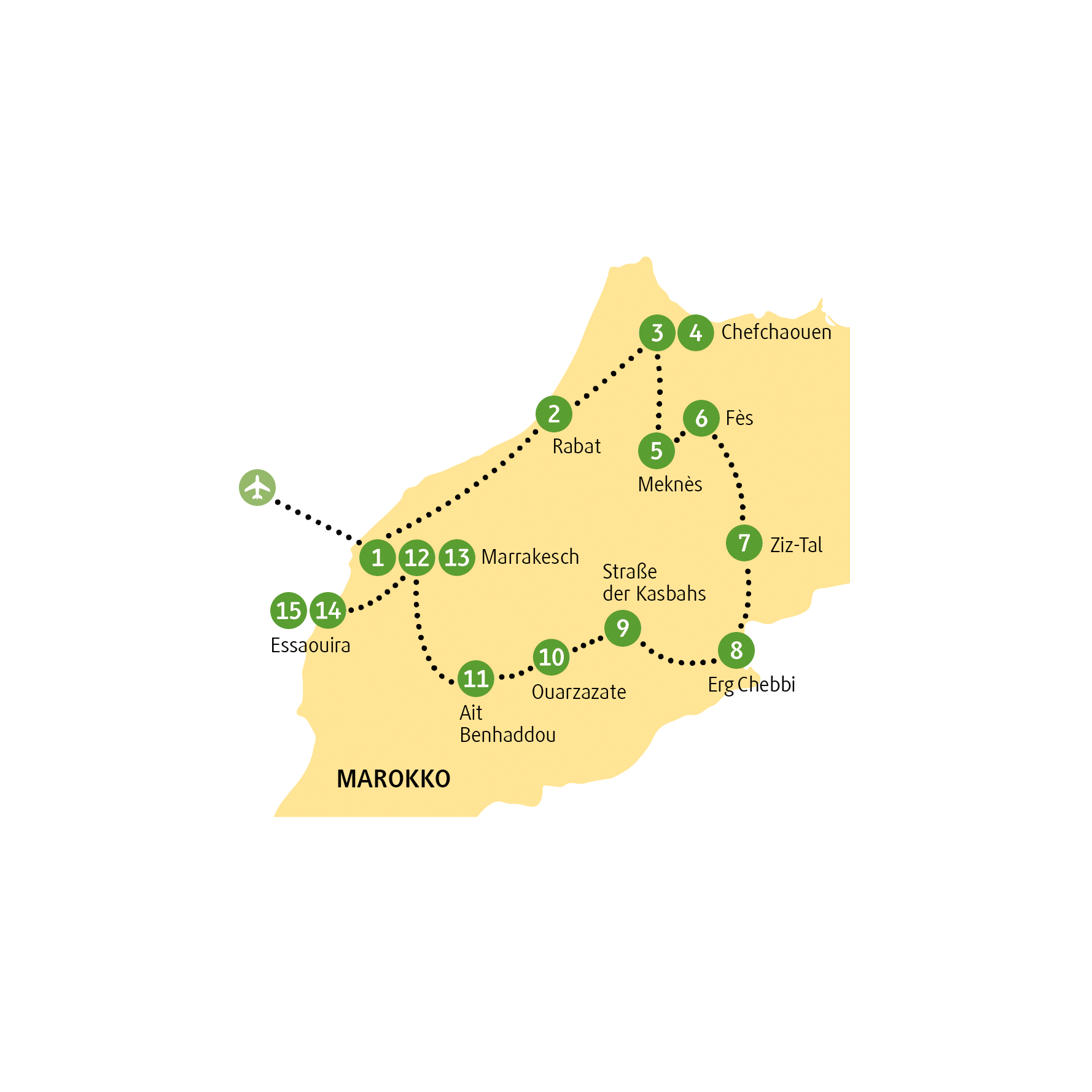 - 14 Übernachtungen in Hotels und Gästehäusern (Riads) sowie in einem komfortablen Zeltcamp in der Sahara