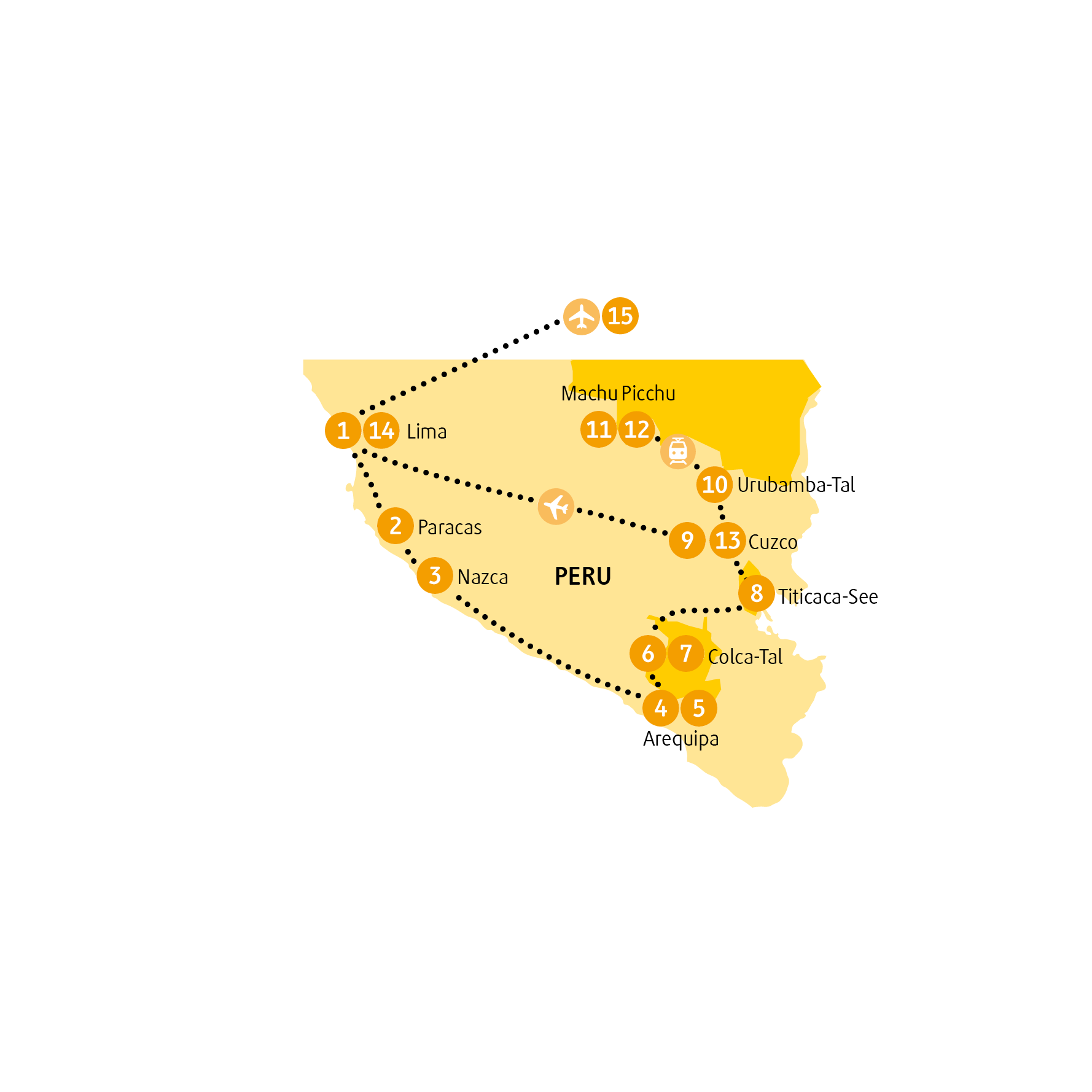 Die Rätsel von Machu Picchu sind längst nicht alle, die dir auf dieser Peru-Reise begegnen. Da sind auch die Dörfer, in denen Menschen heute noch so leben wie damals. Da ist die Inka-Ruine, auf der eine zweite Sixtinische Kapelle steht. Da sind die kilometerlangen Figuren im Wüstensand von Nazca, das Heilige Tal Urubamba, die Nachkommen der Uros, die auf Schilfinseln im Titicaca-See leben und der Kondor, millionenfach besungen, wie er durch die Lüfte der Anden vorbeizieht.
